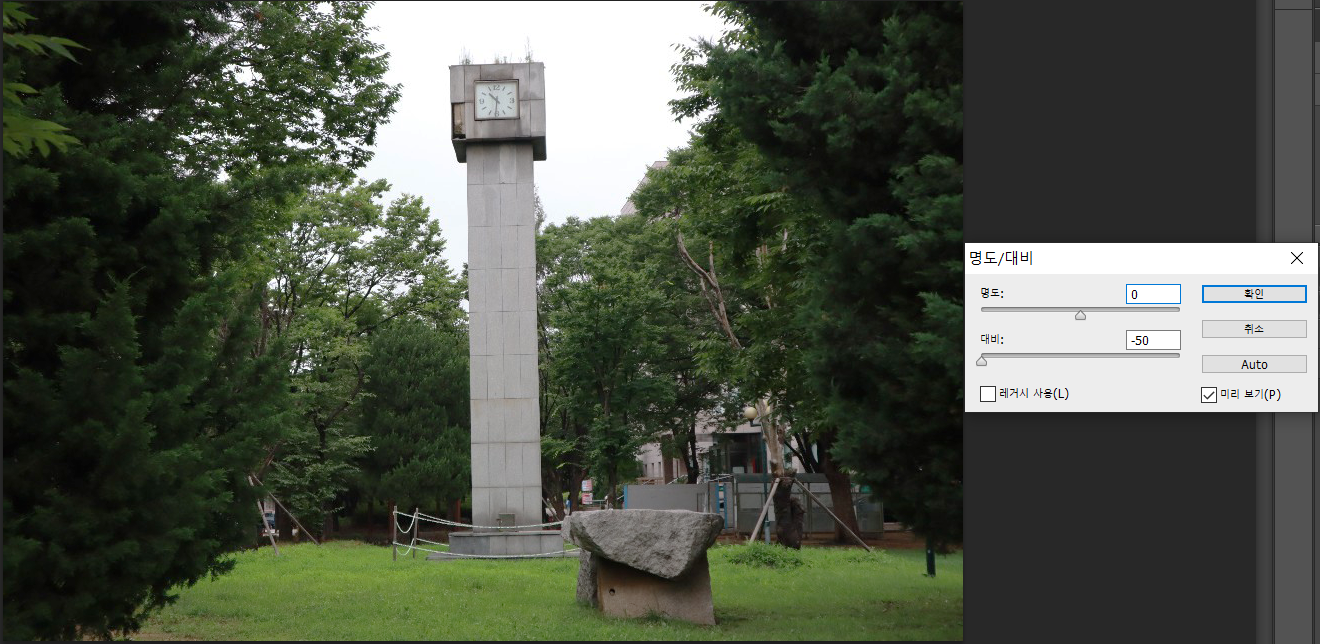 포토샵에서 명도는 밝기, 대비는 어두운 부분과 밝은 부분의 차이를 말한다.